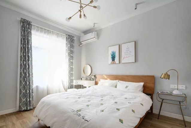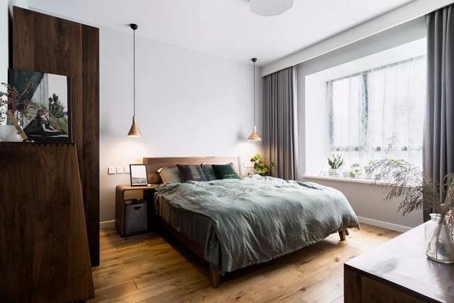 ▲臥室內(nèi)以灰色為主,搭配一盞樹枝造型銅藝燈,原木床鋪了清新文藝的床單,加上幾何圖形的灰白色窗簾點綴,給人舒適放松的氛圍感。
