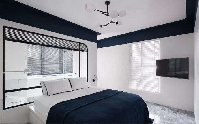 ▲臥室天花與墻面以普藍色乳膠漆銜接,同時以室內(nèi)窗打通了臥室和衛(wèi)生間,配合整體的白墻,顯得特別的開闊明亮。
