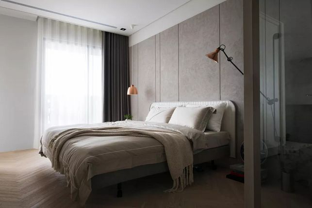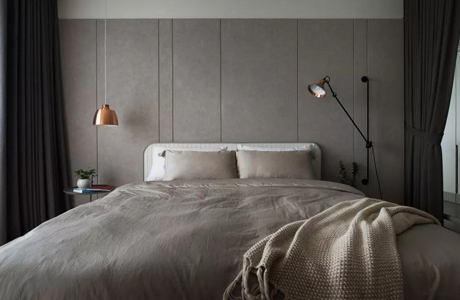▲臥室,床頭墻與床鋪形成灰-白-灰的層次過渡,結(jié)合不對稱的床頭布置,在提升活躍度的同時,也將高級灰的低調(diào)優(yōu)雅發(fā)揮到極致。