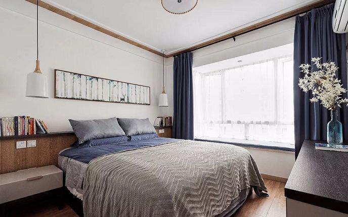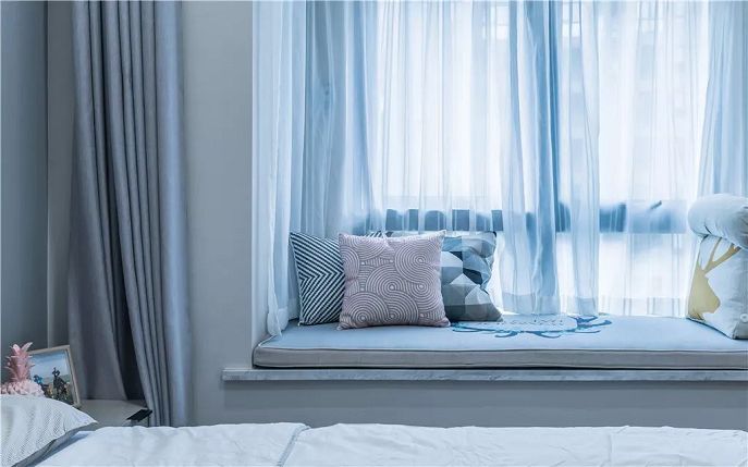 ▲臥室整體延續(xù)清新明快的空間感,飄窗的米色與藍色窗簾增加素雅視覺。
