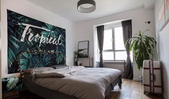 ▲臥室背景墻是一幅超大的裝飾壁布,與白墻形成鮮明對比,富有層次感。