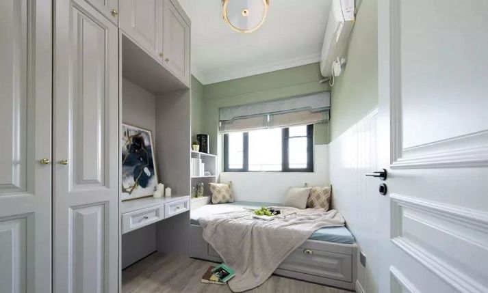 ▲臥室綠色墻面與白色護墻,木作榻榻米連接系統(tǒng)柜,兼具寫字臺功能,休憩收納兩不誤。