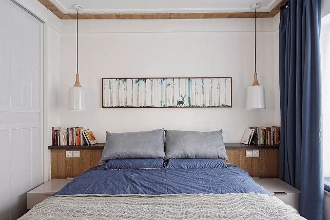 ▲床頭設計了半高矮墻,方便收納常用的物品,窗簾與床品同一色系,藍色營造靜謐舒緩的睡眠空間。