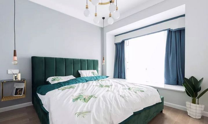 ▲臥室床頭背景墻選擇了淺灰綠色,搭配深藍色床頭靠背和素凈的床品,以水墨裝飾畫的輕柔,引出安靜悠閑的舒適感。