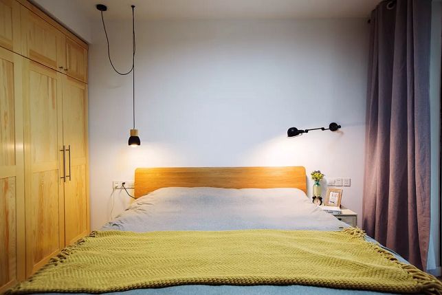 ▲臥室沒有過多的裝飾,一邊木質(zhì)小吊燈、一邊伸縮壁燈,躺在床上各有一片空間來做自己想做的事。