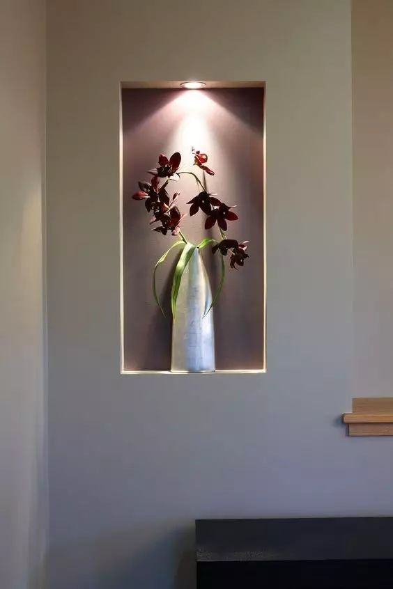 正對(duì)大門空空的墻面覺得沒有情調(diào),制作壁龕、安裝幾盞小壁燈、放上精心挑選的裝飾品,情調(diào)馬上營造出來,推門進(jìn)屋就是滿滿的好心情。