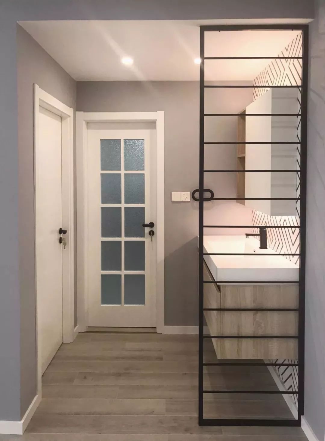 衛(wèi)生間是比較私密的空間,而一般衛(wèi)生間門兩側(cè)都會(huì)比較缺少采光,為避免小空間昏暗擁擠的視覺感,衛(wèi)生間這扇門一般是選擇磨砂質(zhì)感的玻璃門。