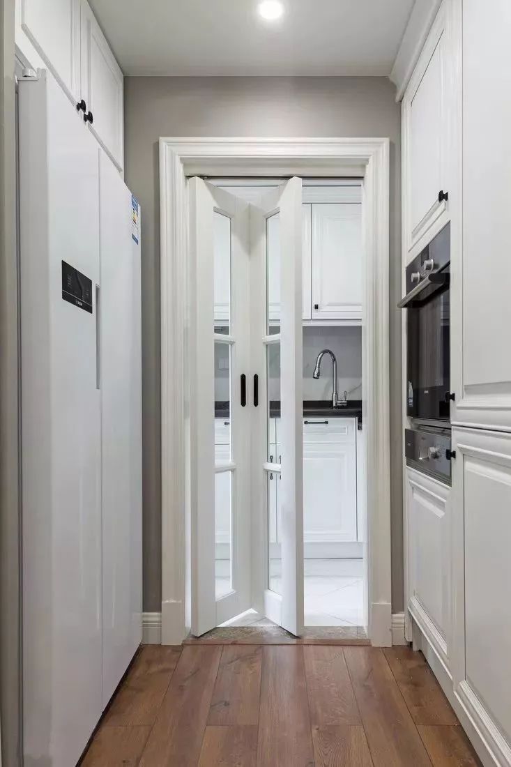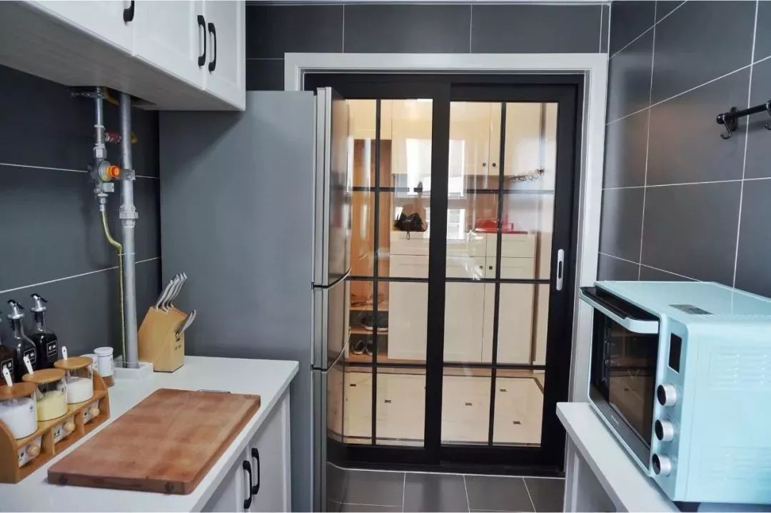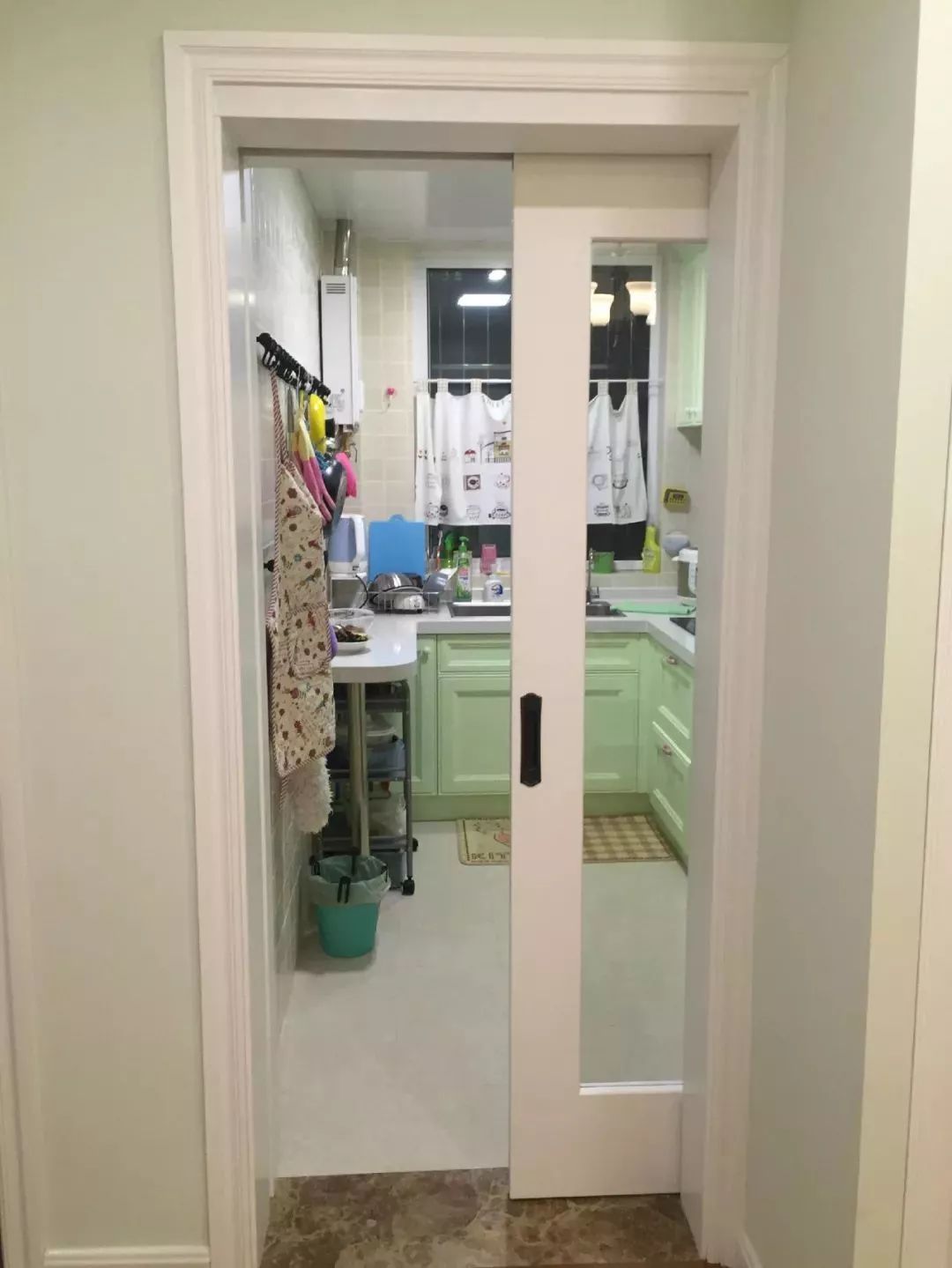 廚房門是客餐廳與廚房交接的窗口,這個(gè)門一般都是以玻璃推拉門為主,這樣可以為在保持空間的通透的同時(shí),又隔斷油煙對(duì)公共空間的侵襲。