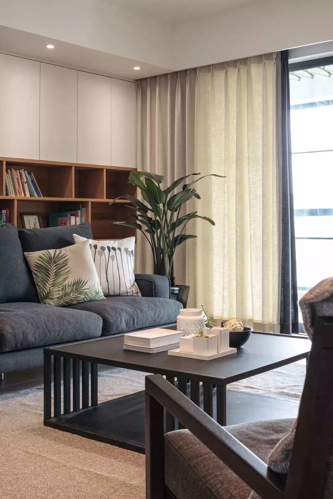綠植圖樣的抱枕搭配客廳沙發(fā)旁大綠植裝飾,清新大氣,十分耐看。