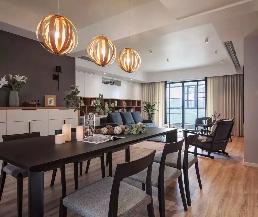 餐廳就在客廳的旁邊,做成開(kāi)放式設(shè)計(jì),餐廳的吊燈很有特色。