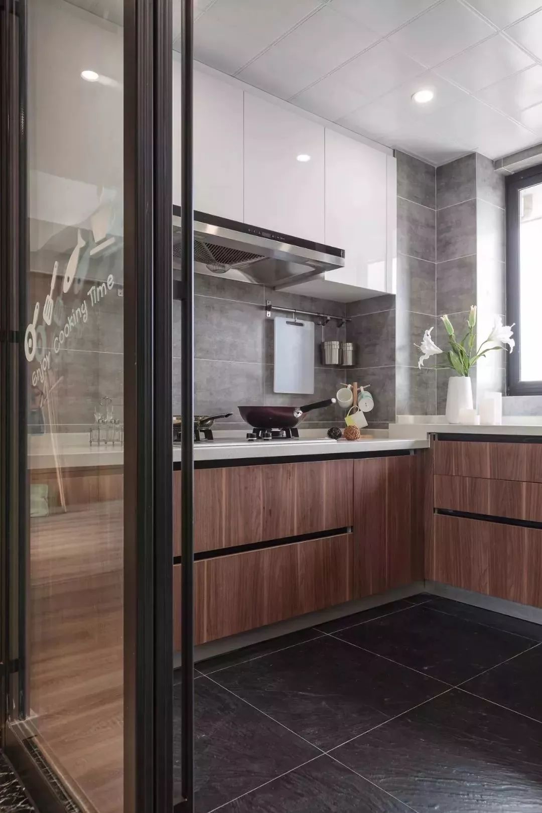 耐臟的黑色地磚、水泥灰墻磚,木質(zhì)的一體式櫥柜,將廚房打造成開(kāi)闊大氣的復(fù)古空間。
