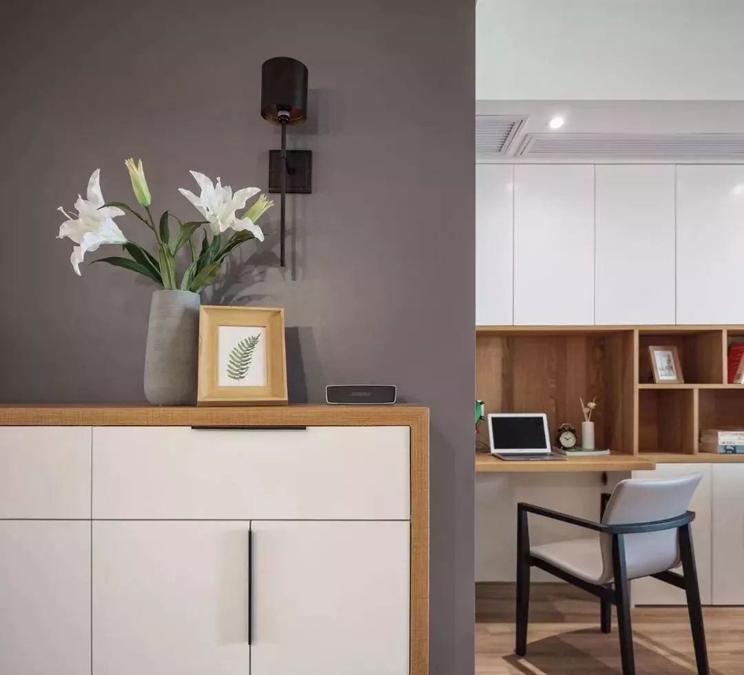 整體收納墻,收納柜+置物架組合,置物架用作書(shū)架,旁邊設(shè)計(jì)一個(gè)小小的工作臺(tái),方便工作閱讀。