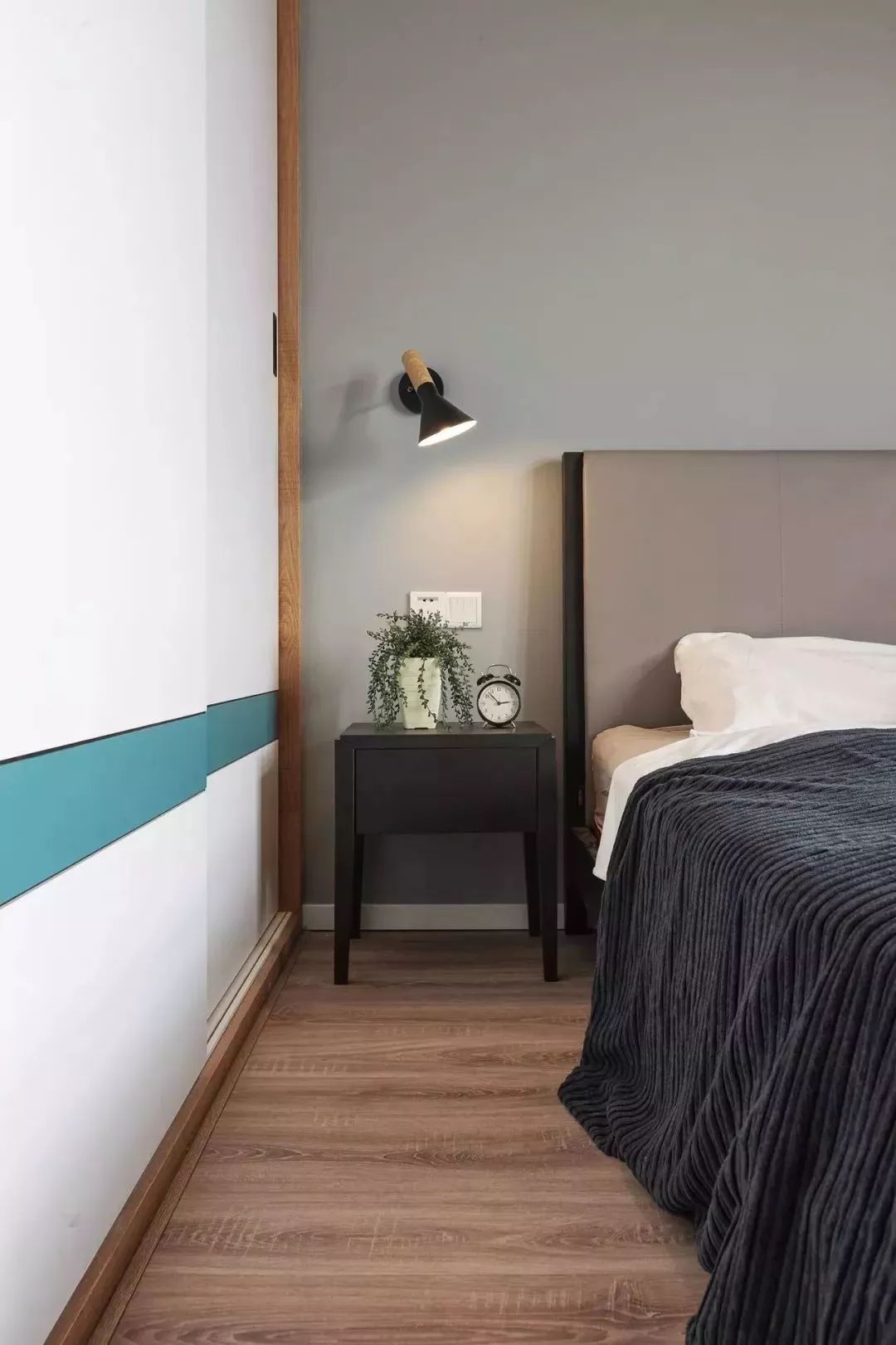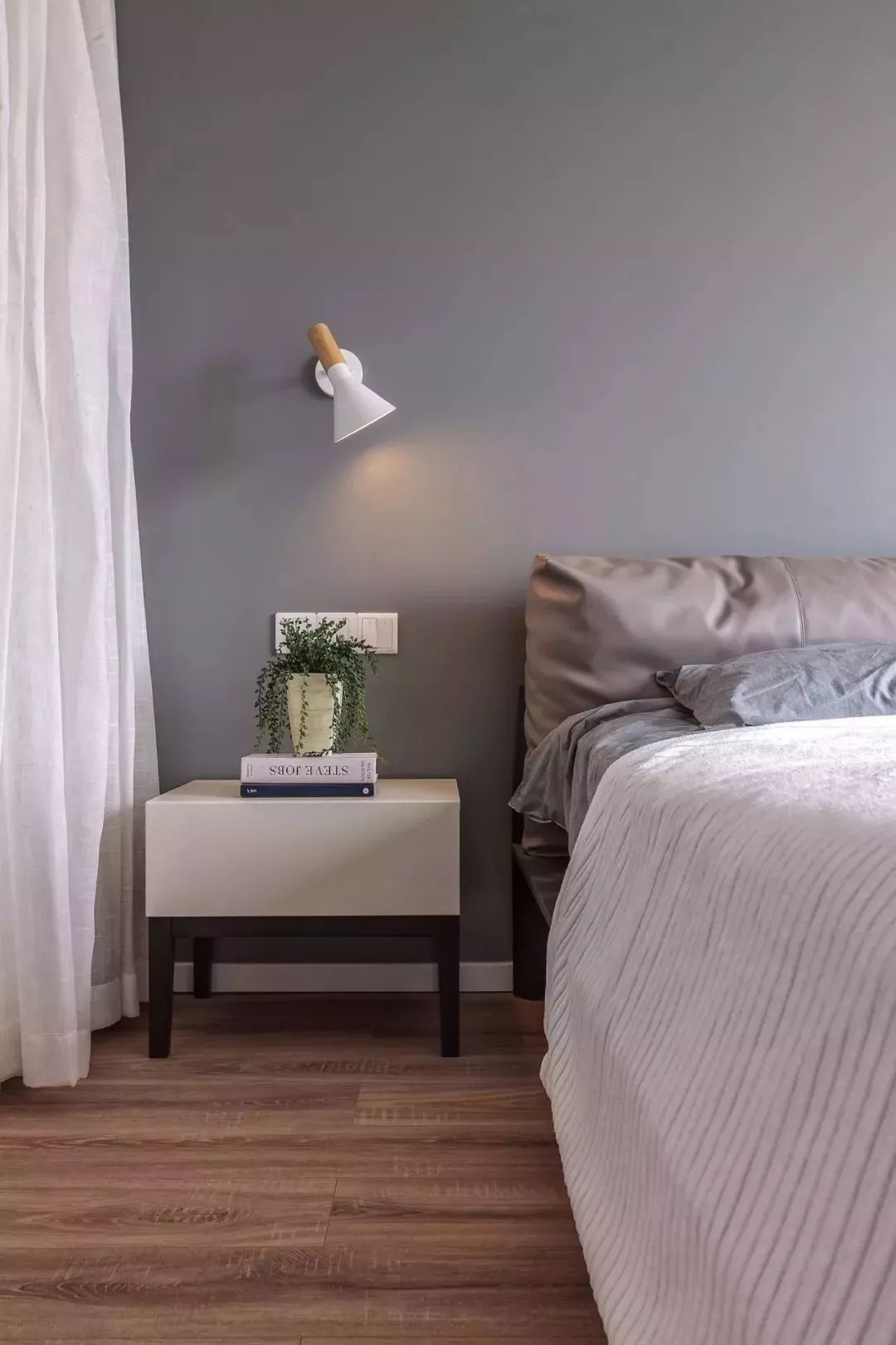 同樣也在白色的床頭柜上擺上綠植,在獨(dú)特的壁燈的光照下,充滿(mǎn)生機(jī)。