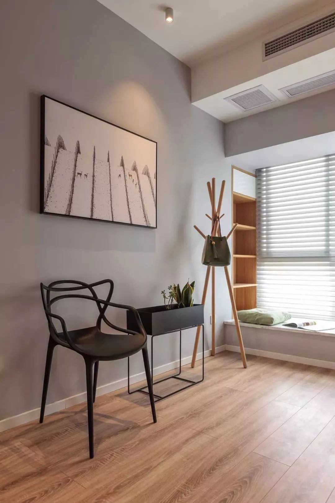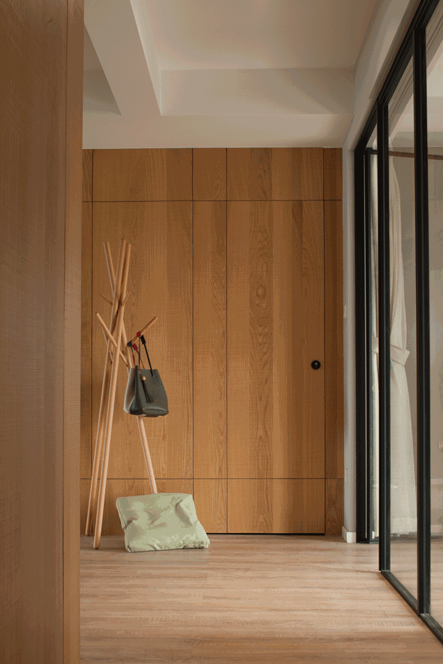 開(kāi)闊的木質(zhì)過(guò)道旁擺著木質(zhì)衣帽架,用來(lái)掛置包包等物品,實(shí)用又美觀,開(kāi)門(mén)便可一睹臥室的風(fēng)采。