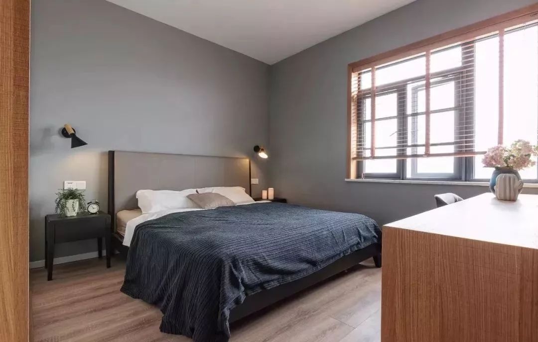 主臥裝修極簡(jiǎn)風(fēng),灰色的乳膠漆裝飾,深色床品,吊頂設(shè)計(jì)也很簡(jiǎn)約。