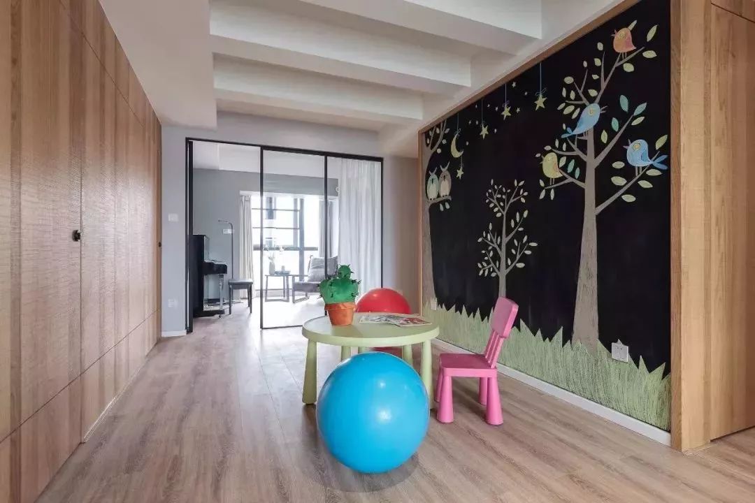 過(guò)道空間非常開(kāi)闊,所以干脆做一個(gè)孩子的游樂(lè)空間,隨意涂畫(huà)的黑板墻,開(kāi)發(fā)孩子的創(chuàng)造力。