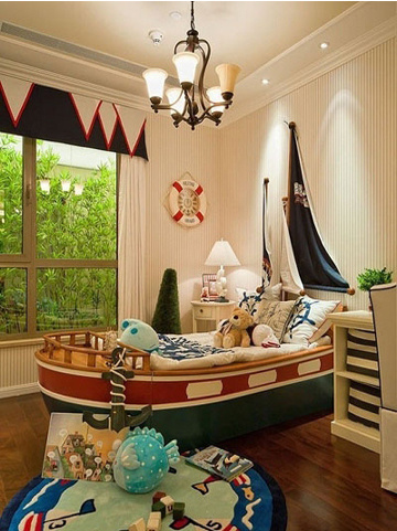 海盜船、救生艇,想象自己就是杰克船長,在加勒比海自在游走,與自然為伴為友。這間兒童房的裝飾品不僅激發(fā)了孩子對未知的好奇,也滿足了航海、探險的幻想;