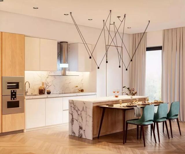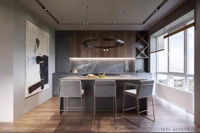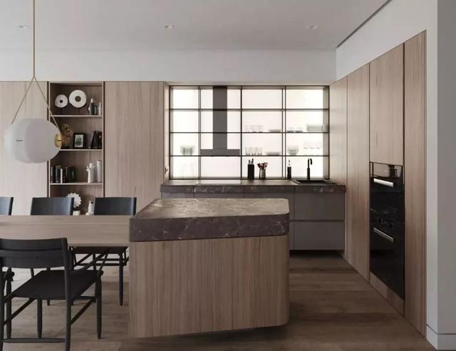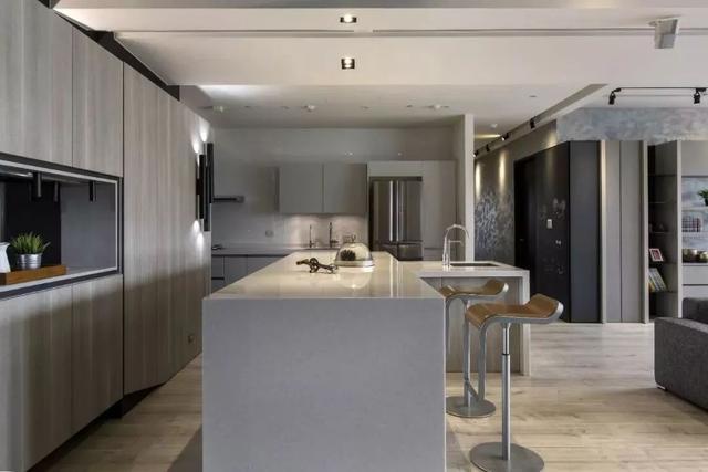 開放式的廚房基礎(chǔ),裝一個中島臺隔出廚房與餐廳區(qū)域,這樣可以增加餐廚互動,老公炒菜、老婆在中島臺準(zhǔn)備料理,讓家人共同參與烹飪的樂趣,比較適合面積較大的戶型。