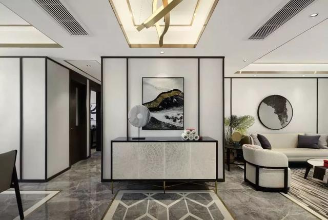 這種通常是進(jìn)門(mén)兩側(cè)是客餐廳的戶型,這個(gè)空間通常都比較大,要做吊頂?shù)脑挘饕亲隹筒蛷d的過(guò)渡,同時(shí)在門(mén)口區(qū)域做個(gè)留空的藏?zé)魠^(qū),讓空間界分明顯而又有層次感。