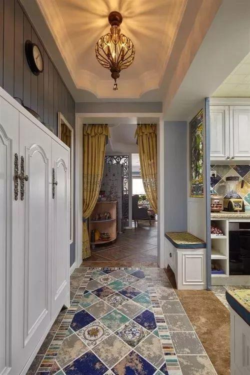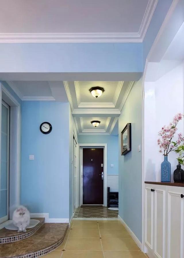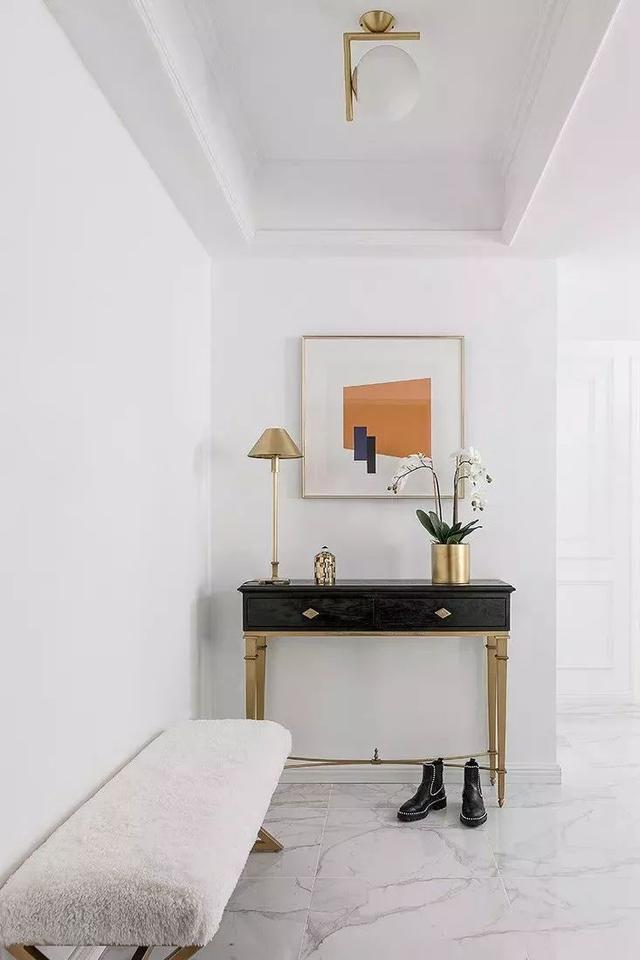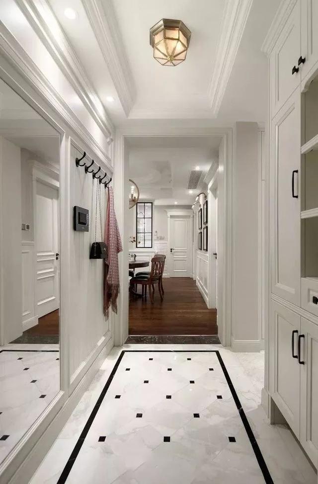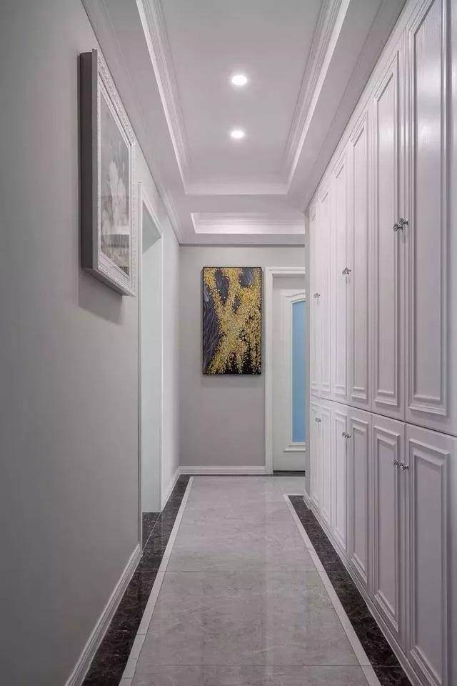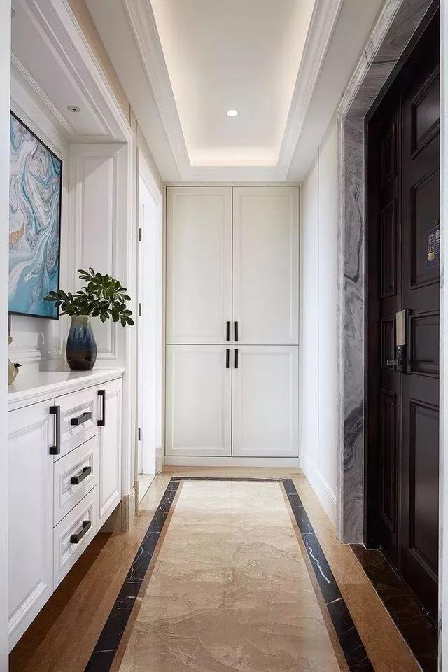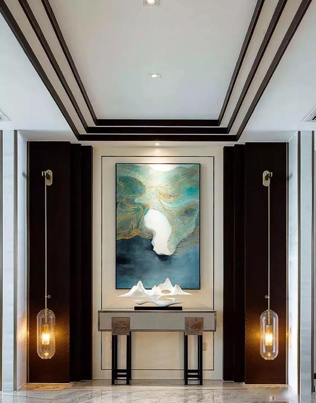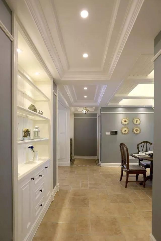 比較常見(jiàn)的玄關(guān)走廊吊頂方案是在四周吊頂,然后中間留空并根據(jù)空間搭配裝上吊燈或則在吊頂造型里面暗藏?zé)魩?,讓空間層次豐滿而又有優(yōu)雅的空間感。