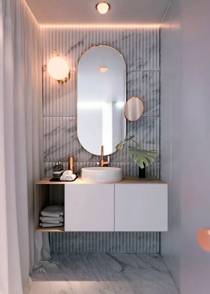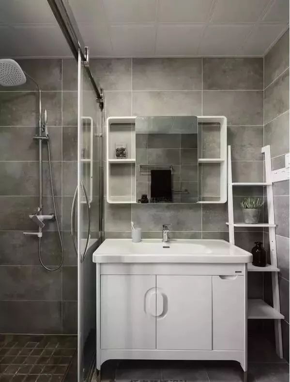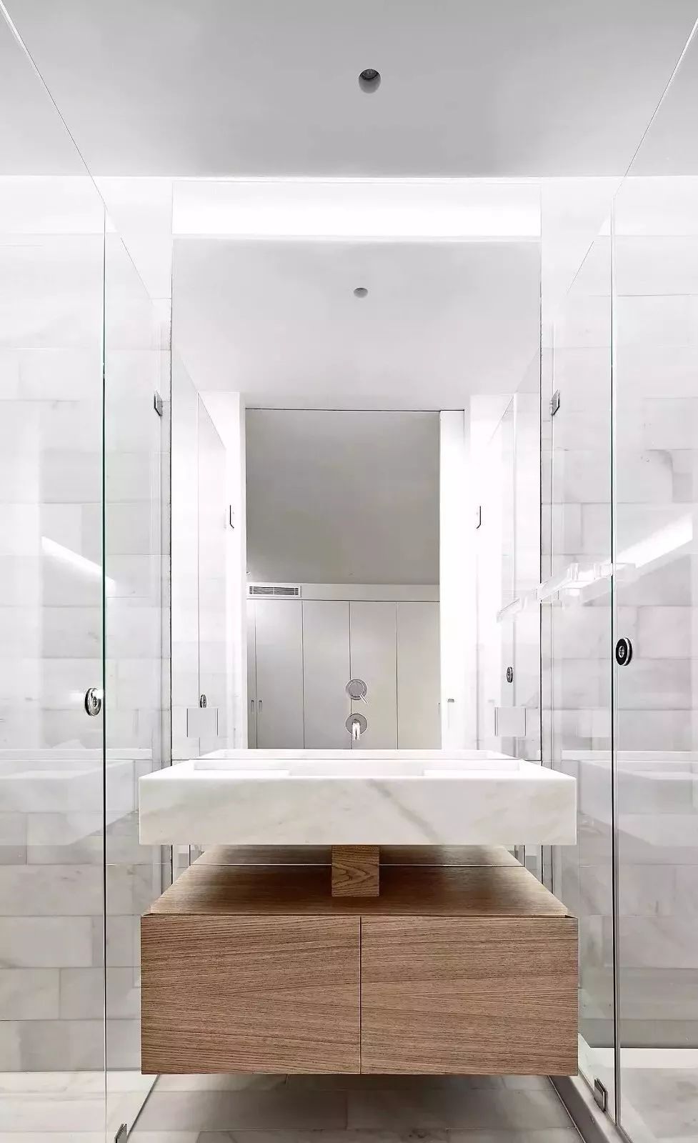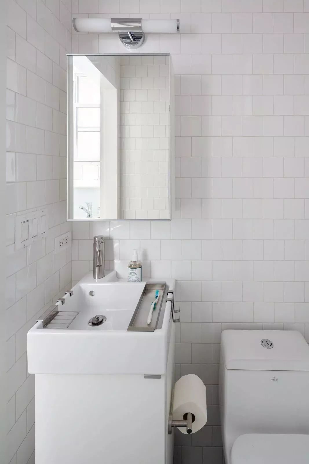 除此之外,大容量的鏡面柜、嵌入式壁龕、簡易隔板等,也能最大化地將立面空間利用起來,不但有效減輕了視覺負(fù)擔(dān),也令整個空間看起來更加干凈利落。