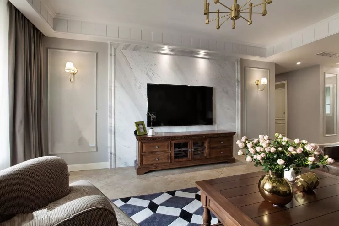電視背景作為家里的視覺焦點,可以在上面多花一點心思。將壁紙、大理石、地板這些材質(zhì)都試試裝在電視后面,這樣的背景墻非常簡約但又不覺單調(diào)。