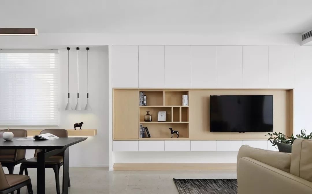 ▲收納型電視墻,當(dāng)前比較流行,還非常受年輕人喜歡,可以選擇定制的方式,設(shè)計(jì)一整面柜子,中間留出安裝電視的位置,正如圖上這效果,這里比較聰明的是,電視旁邊,也設(shè)成開放式,擺些書籍、飾品,既美觀實(shí)用,還讓整體看著更協(xié)調(diào)。白色+原木色自然簡約,舒適漂亮。