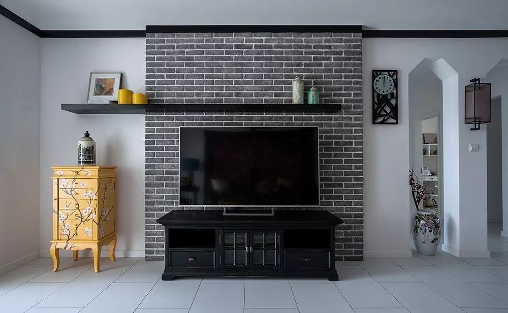 ▲這一款電視墻的造型設(shè)計(jì),也算是比較個性的,這是墻壁中間區(qū)域,直接是瓷磚上墻的方式。然后墻壁上方,還裝了黑色隔板,可以放些裝飾品,效果不錯。最主要是和電視柜、天花板黑色裝飾顏色一樣,整體保持了統(tǒng)一,更協(xié)調(diào)大氣。