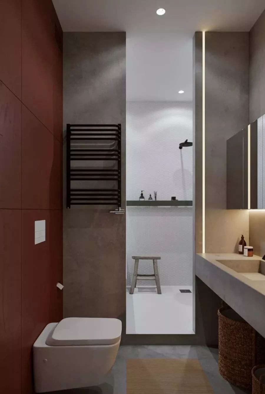 如果不喜歡大面積的粉色調(diào),你也可以進(jìn)行局部裝飾,再利用簡潔利落的黑色線條及隱藏式燈光稍加點(diǎn)綴,就能讓衛(wèi)生間成為家中的一大亮點(diǎn),更增添了時尚優(yōu)雅的氣質(zhì)。