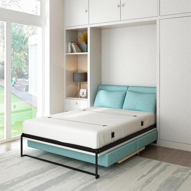 書柜里面夾雜隱形床,拉出來變成床一張,臥室、書房兼具,并且藏書空間也最大化。