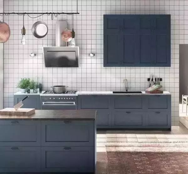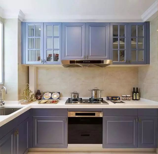 如果櫥柜是深藍(lán)色,廚房用灰、白等中性色搭配都o(jì)k。