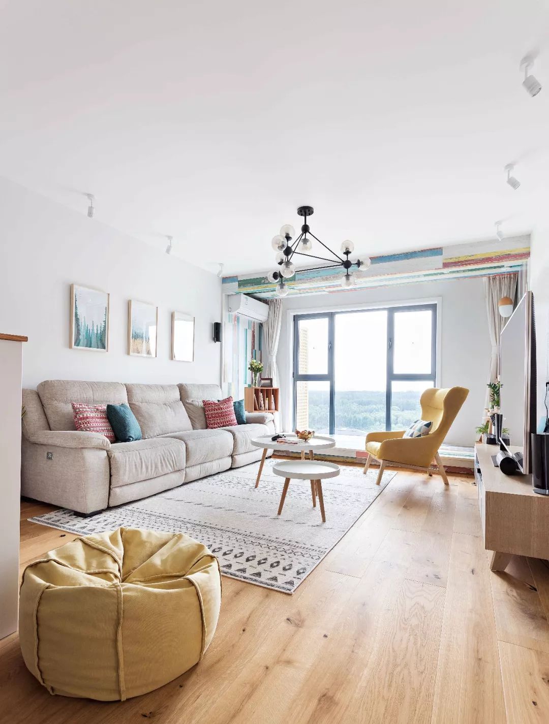 ▲ 陽(yáng)臺(tái)被打通,大大的落地窗給客廳帶來(lái)超棒的采光,也提供了絕佳的視野。ins風(fēng)地毯增強(qiáng)空間層次感,為室內(nèi)營(yíng)造一種寧謐、雅致的氣氛。