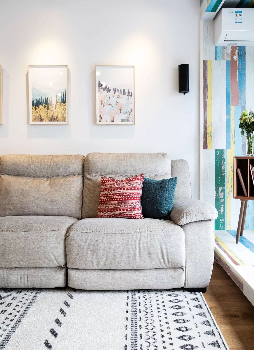 ▲在客廳留白的背景墻面用掛畫(huà)裝飾,淺灰色的布藝沙發(fā)搭配波西米亞風(fēng)的紅、藏青色抱枕,點(diǎn)綴得恰到好處。