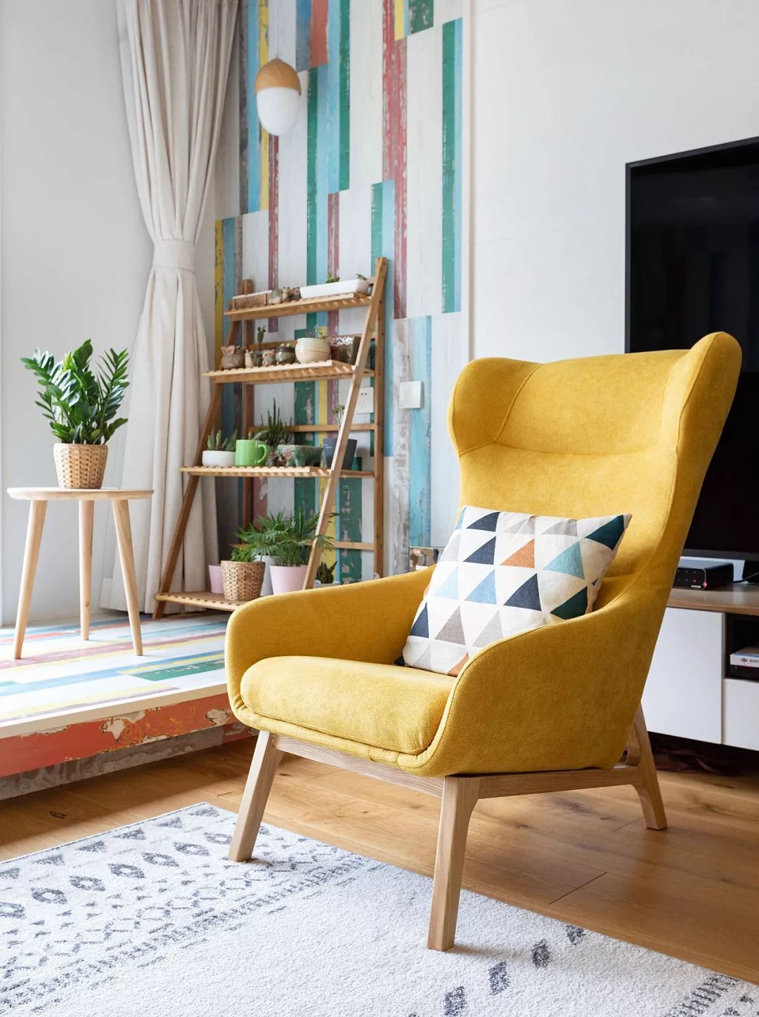▲ 檸檬黃單人沙發(fā)舒適感十足,提亮了整個(gè)空間。