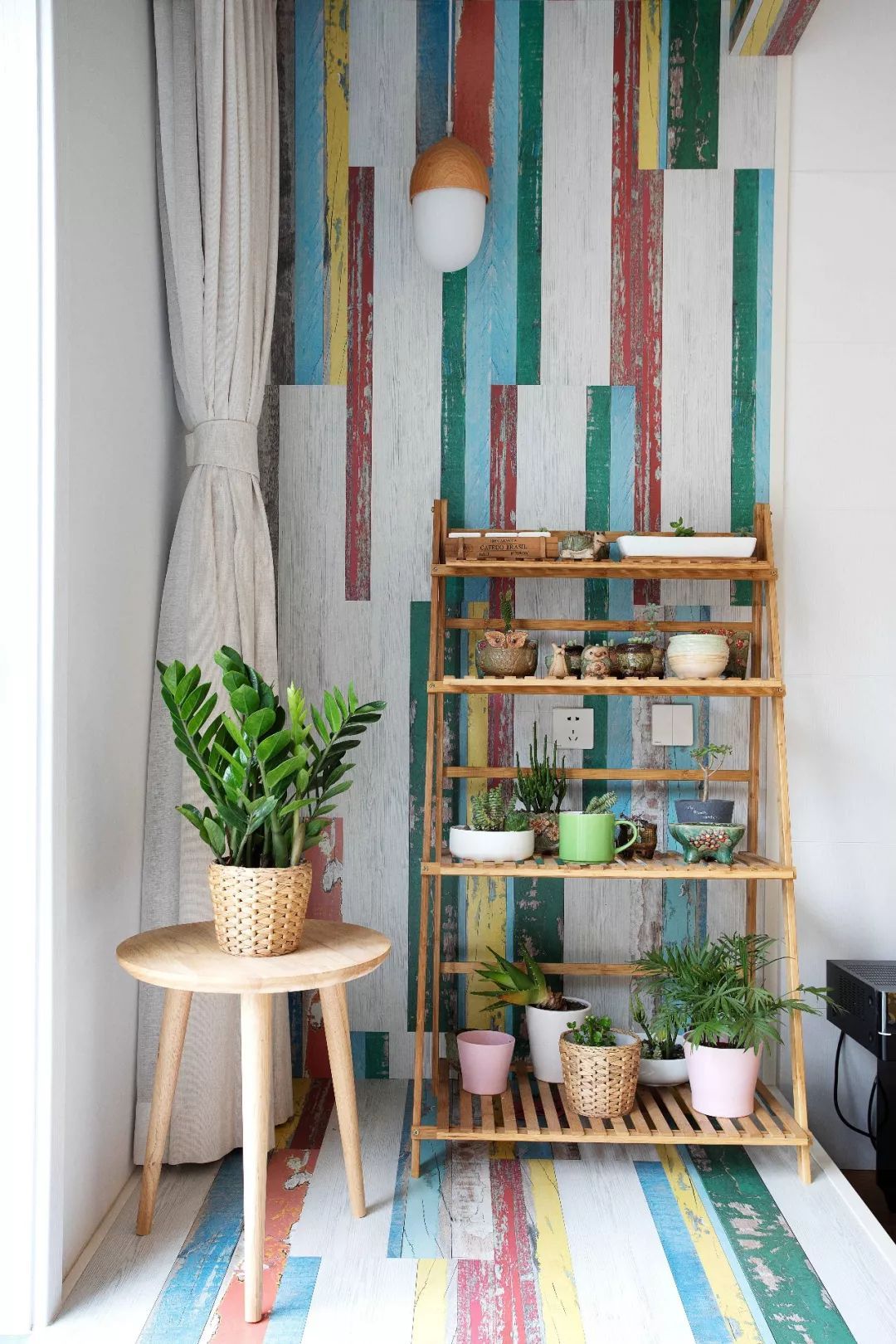 ▲ 陽(yáng)臺(tái)另一側(cè)擺放了置物架用于種植盆栽綠植,為家里增添清新自然之感。
