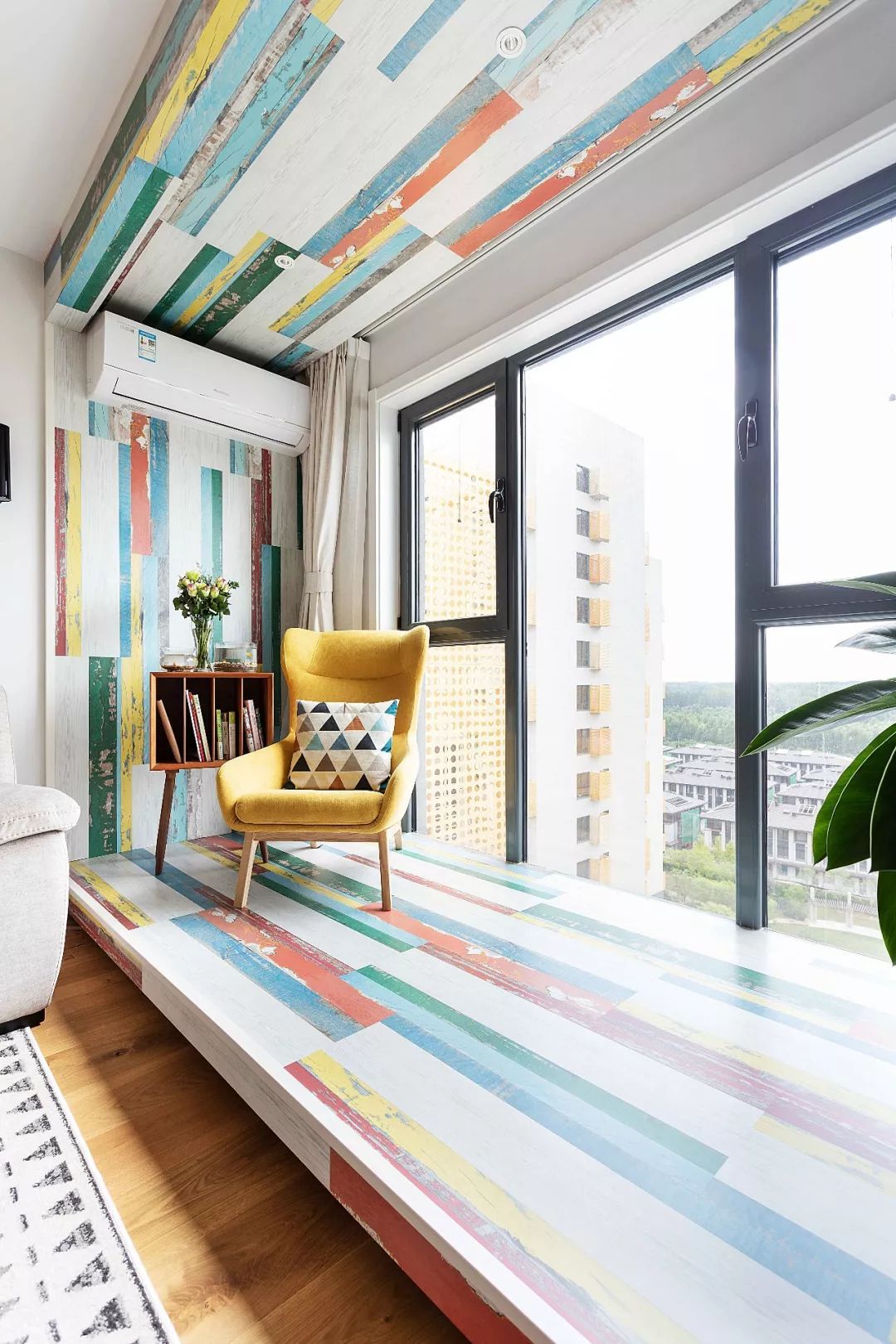 ▲ 在陽(yáng)臺(tái)的墻面、地面和頂面刷上了彩漆,打造出具有藝術(shù)氣息的休閑空間。用單人沙發(fā)搭配小巧實(shí)用的雜志柜,營(yíng)造輕松休閑的娛樂(lè)空間。