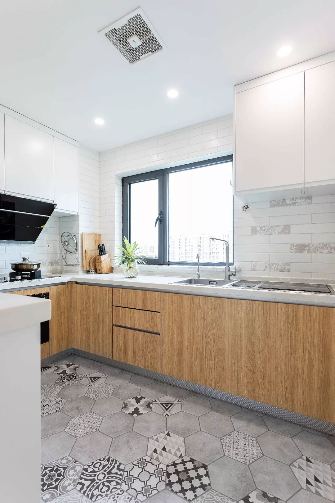 ▲ 開(kāi)放式廚房通過(guò)中島臺(tái)和餐廳進(jìn)行隔斷,地面由六邊形花磚和木地板進(jìn)行完美拼接過(guò)渡,令空間增色不少。