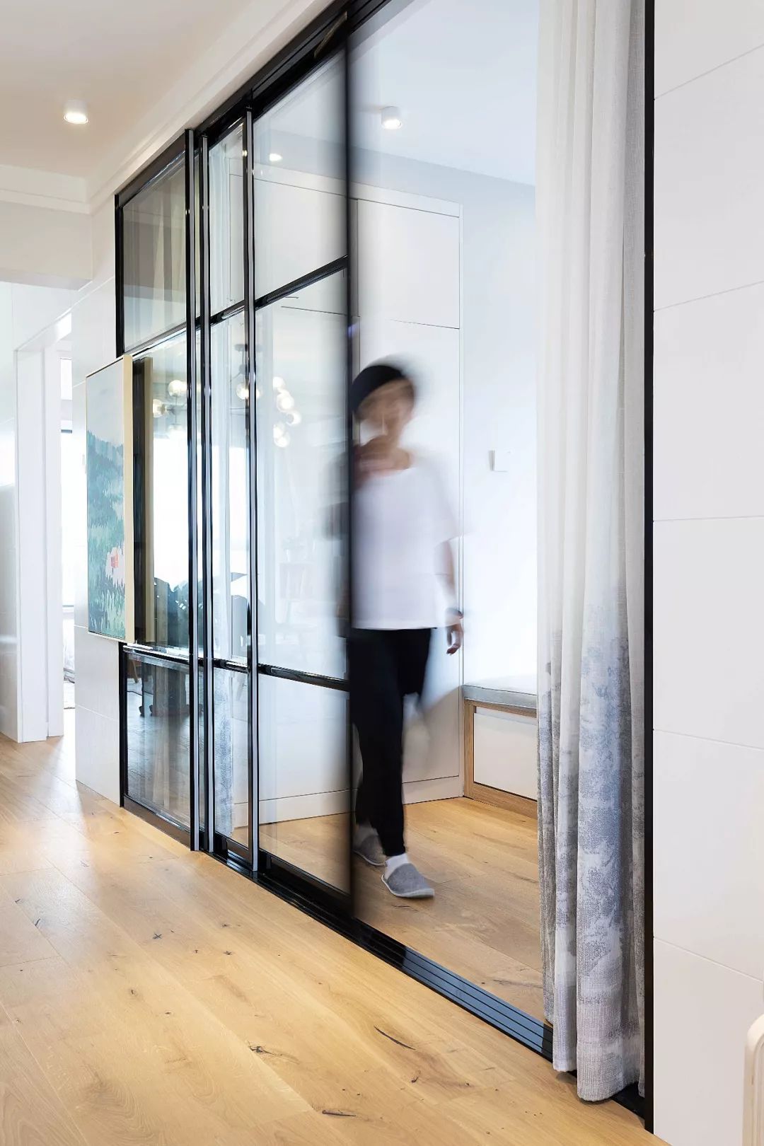 ▲ 書(shū)房與餐廳之間的墻體拆除,取而代之的是黑框玻璃推拉門(mén),使得空間看起來(lái)更大,光線更加通透。