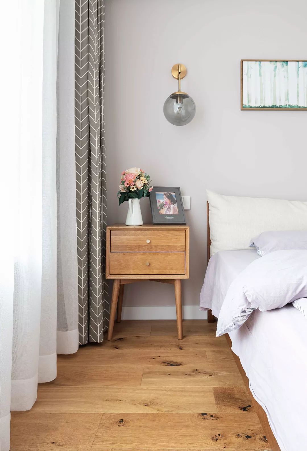▲ 小巧的床頭柜上簡(jiǎn)單的擺放花束與相框,與別致的壁燈一起,打造了簡(jiǎn)約不失格調(diào)的床頭一角。