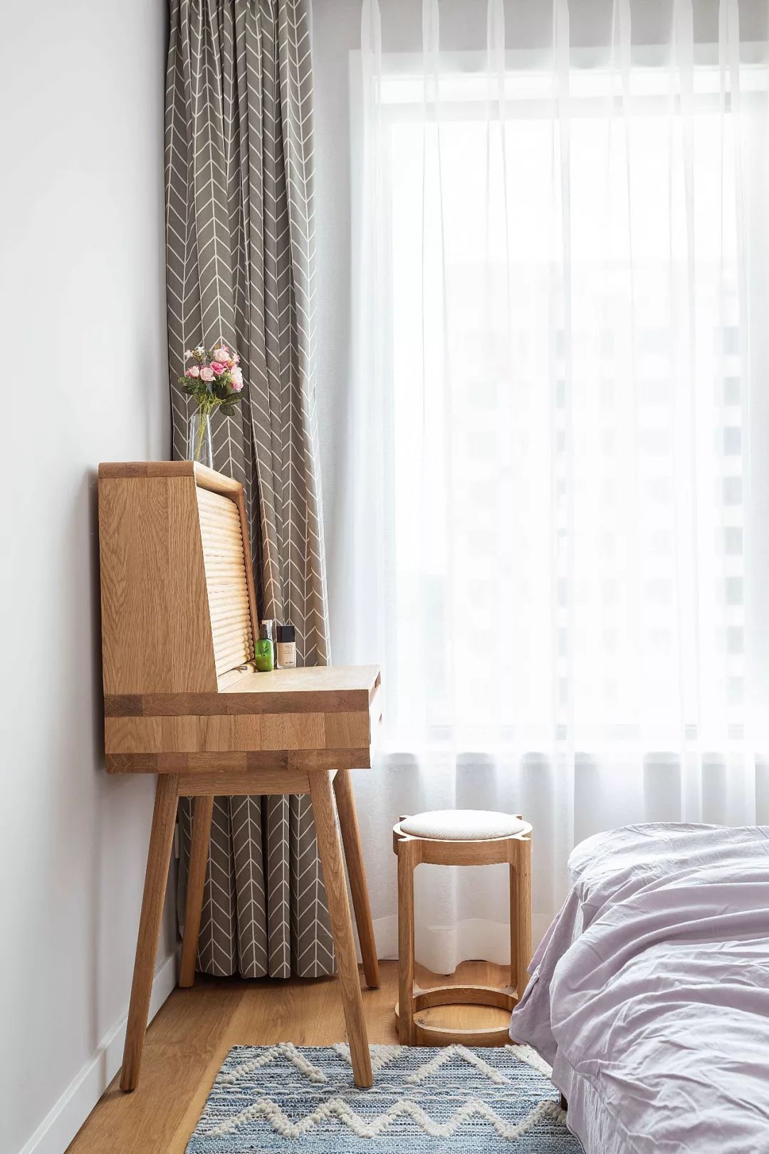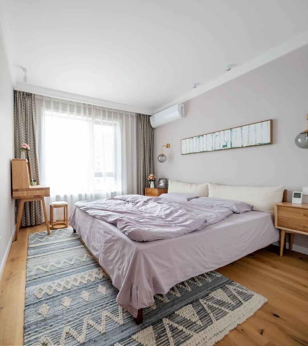 ▲ 主臥的整體色調(diào)偏暖,多選用木質(zhì)家具,再搭配粉紫色床品,溫馨又舒適。地毯很好的裝飾了空間,增添柔軟愜意的質(zhì)感。