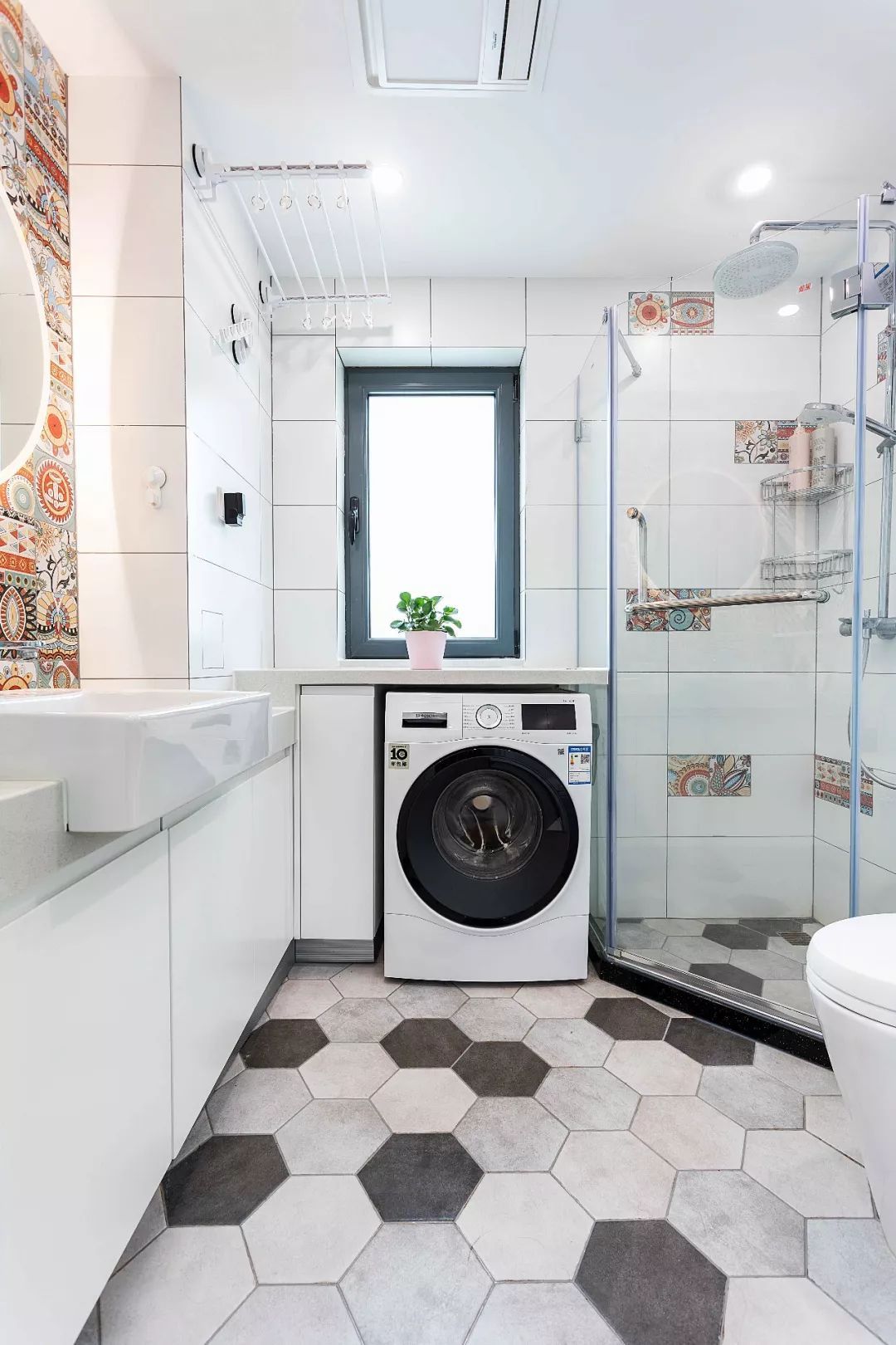 ▲ 浴室柜做了L字形,并把洗衣機(jī)藏入其中,保持整個(gè)空間的干凈、整潔。