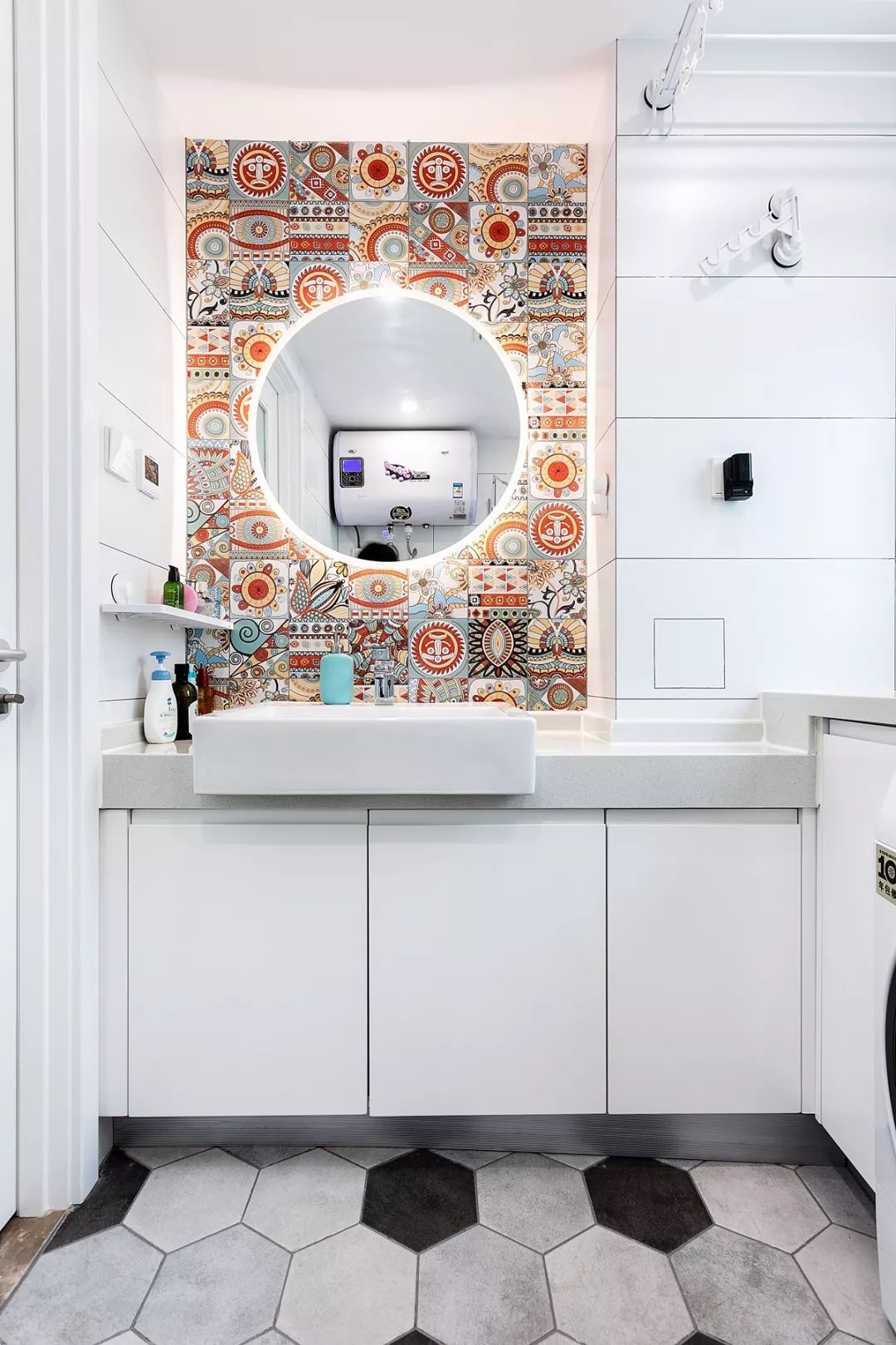 ▲ 洗手盆的位置比較窄,半嵌式的臺(tái)上盆很好地解決了這個(gè)問(wèn)題。墻面彩色花磚圖案精致,配合鏡燈打造出了極具感染力的空間效果。