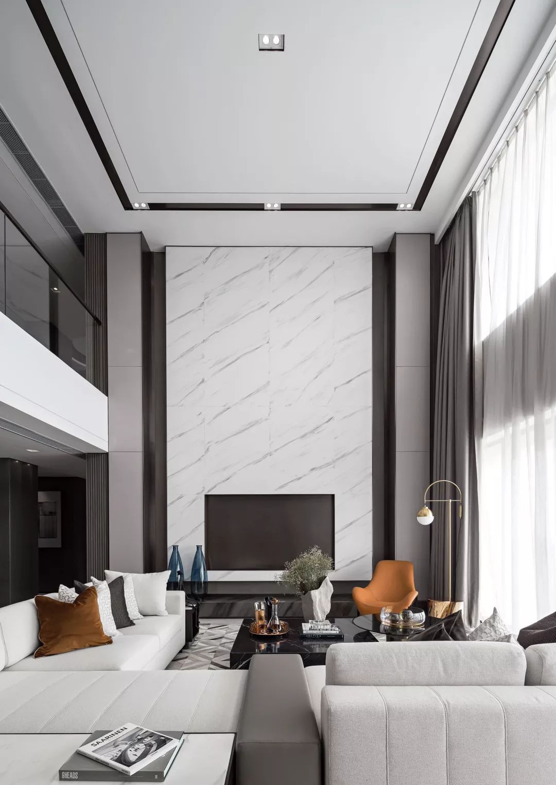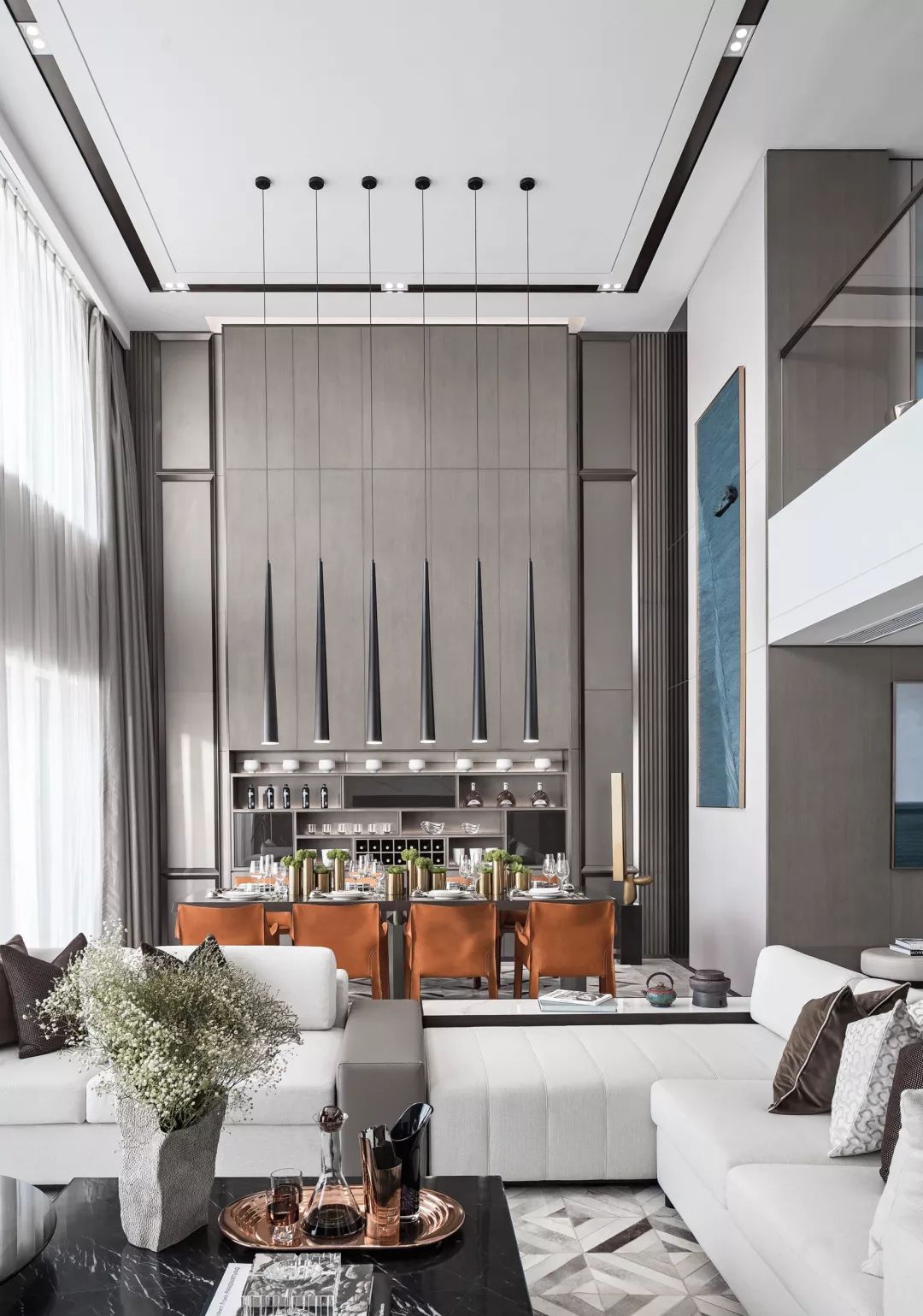 挑高空間設(shè)計(jì)吊頂,一般需要搭配燈飾以及單層或多層裝飾線條進(jìn)行修飾,巧妙地提升空間層次。