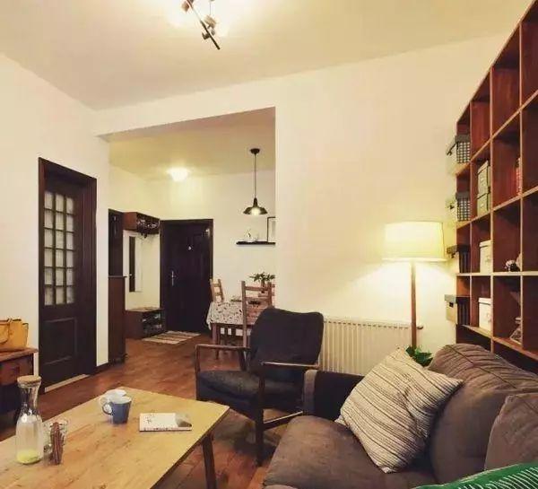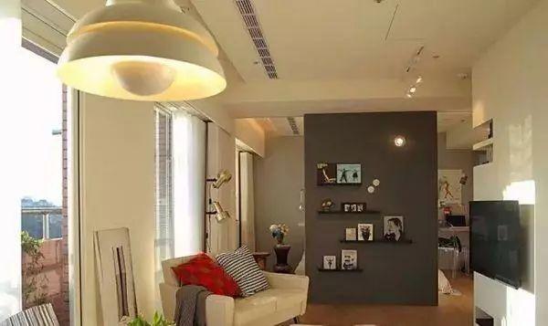 設(shè)計一個半寬隔斷墻壁把客廳和臥室之間隔斷,這樣的設(shè)計占用空間小,而且對空間光線的影響小。隔斷墻也不要浪費(fèi),在墻面上掛壁置物架做收納,可以收納些相框擺件,也增加了空間的裝飾效果。