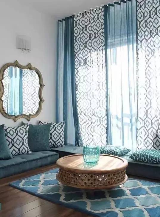 常見的就是窗簾顏色跟著抱枕走,最為安全,有時候可以不用糾結(jié)花色,只要保持顏色一致即可。