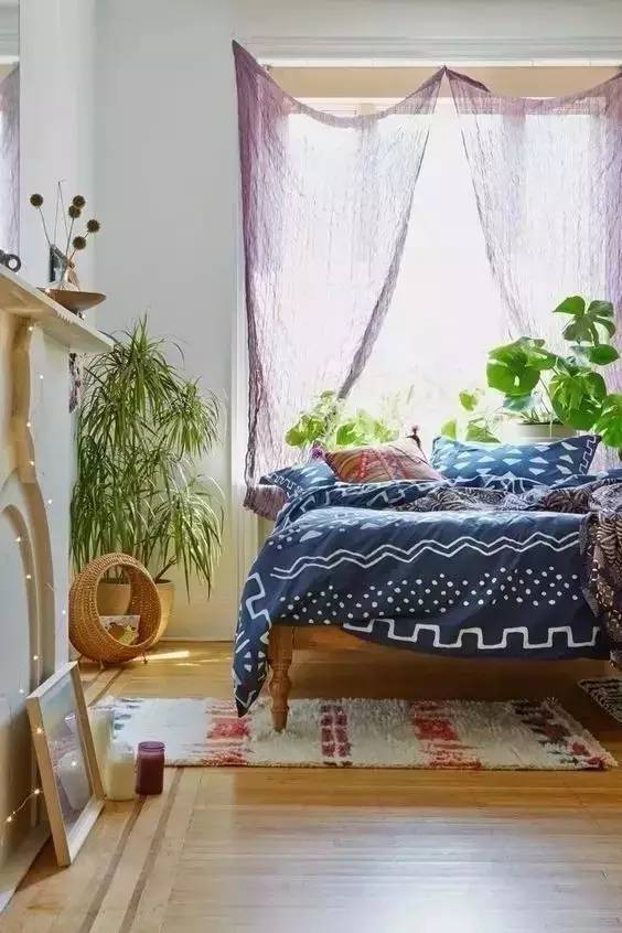 下圖中窗簾與床尾的編織毛毯相呼應(yīng),實在是很聰明,很自然地讓臥室融為一整套。