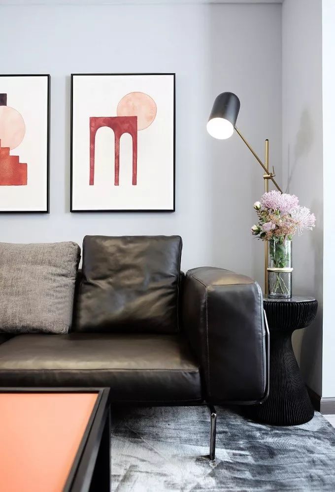 ▲ 沙發(fā)一側(cè)擺放精致簡(jiǎn)約的落地?zé)?,造型別具一格的黑色邊幾加以柔美花束的裝點(diǎn),硬朗不失優(yōu)雅之感。