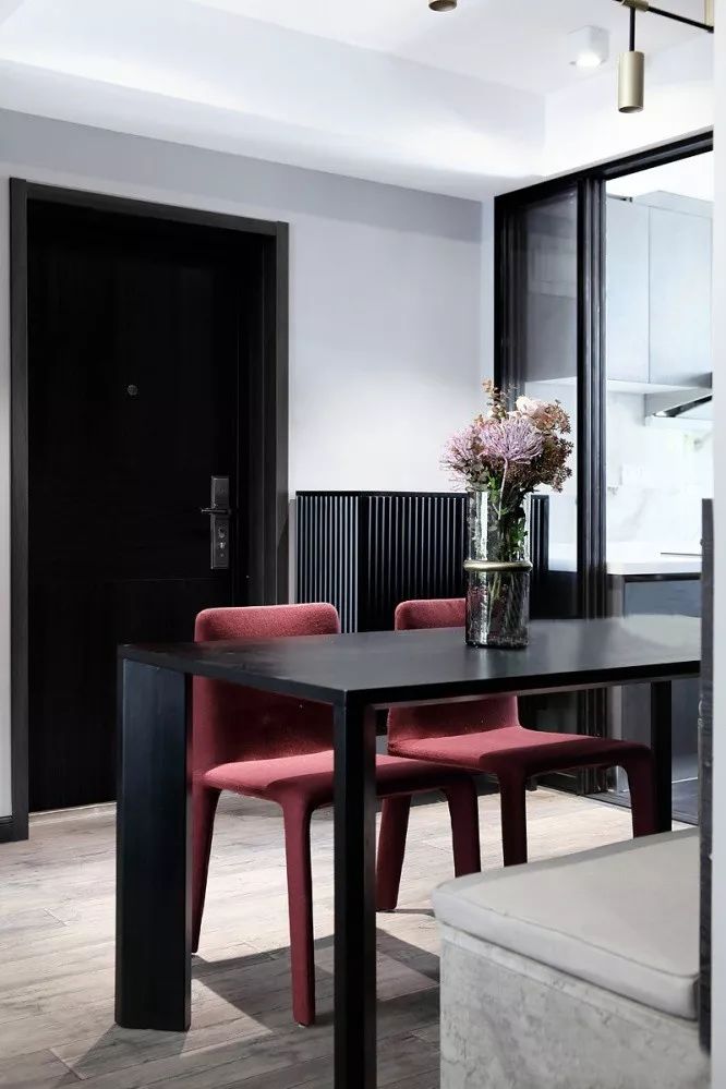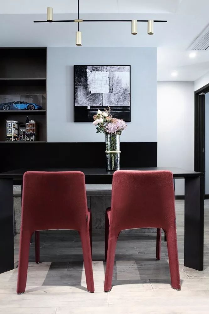 ▲ 低調(diào)內(nèi)斂的高級(jí)灰搭配細(xì)膩精致的質(zhì)感黑,再融入一抹跳脫的紅,打造出時(shí)尚大氣的家居風(fēng)格。