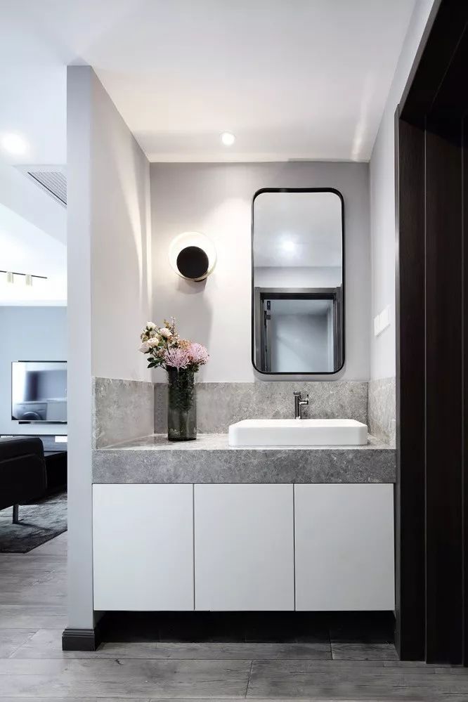 ▲ 衛(wèi)生間也延續(xù)了黑白灰的色調(diào),簡(jiǎn)約而時(shí)尚。灰色大理石洗手臺(tái)旁的花束,為空間增添了一抹溫度。