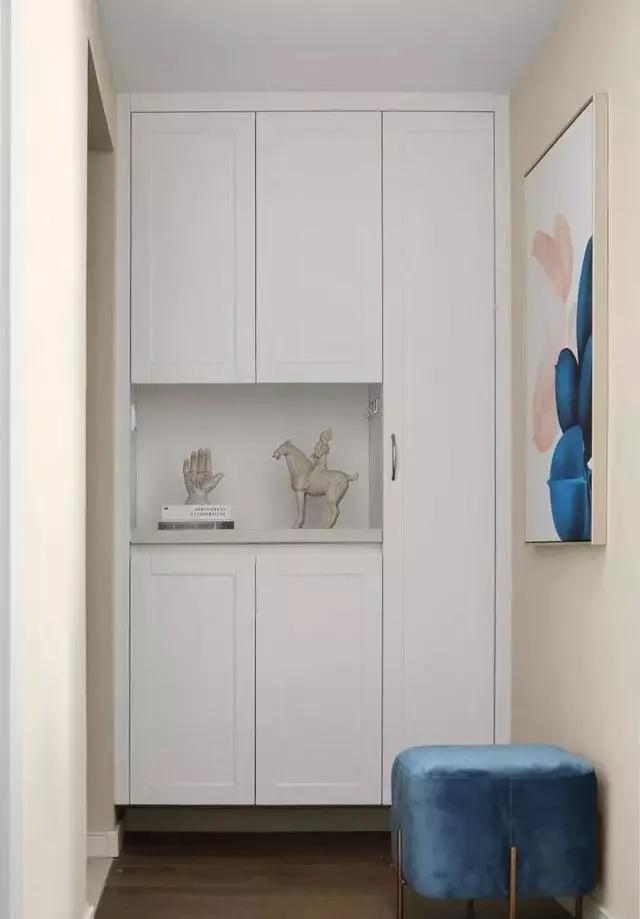 奶咖色的墻面搭配白色鞋柜、藍色絲絨小凳以及一副掛畫就讓人在進門的那一刻就感受到這個家的溫馨與幸福~